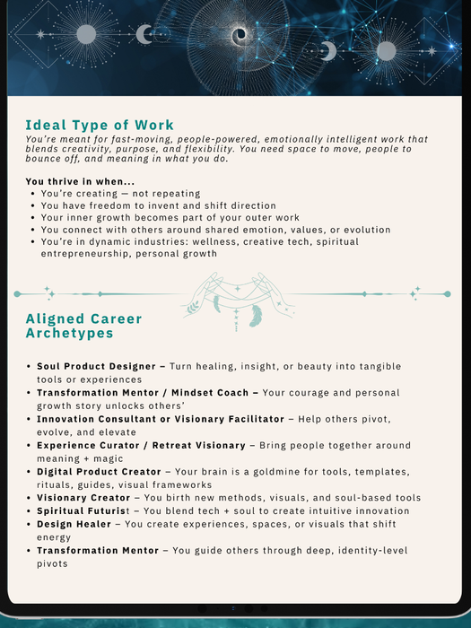 What You’ll Get: ✔ A 25–30+ page MirrorSoul Blueprint PDF tailored to you ✔ Your Human Design + Gene Keys decoded ✔ Aligned career archetypes + ideal industries ✔ Supportive environment + creative work style guide ✔ Identity embodiment guide to manifest your next career moves 💫 Delivery: Within 5–7 business days via email